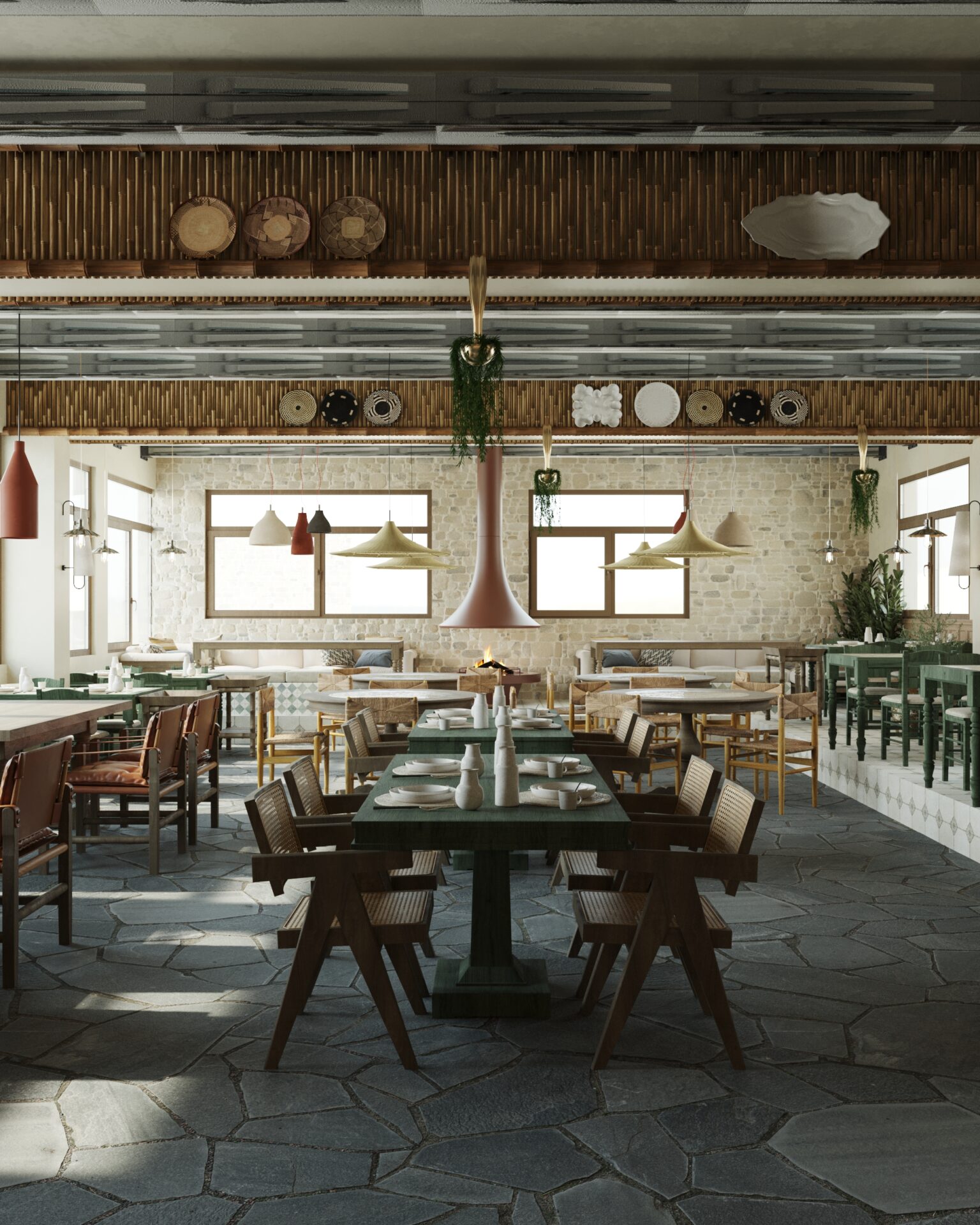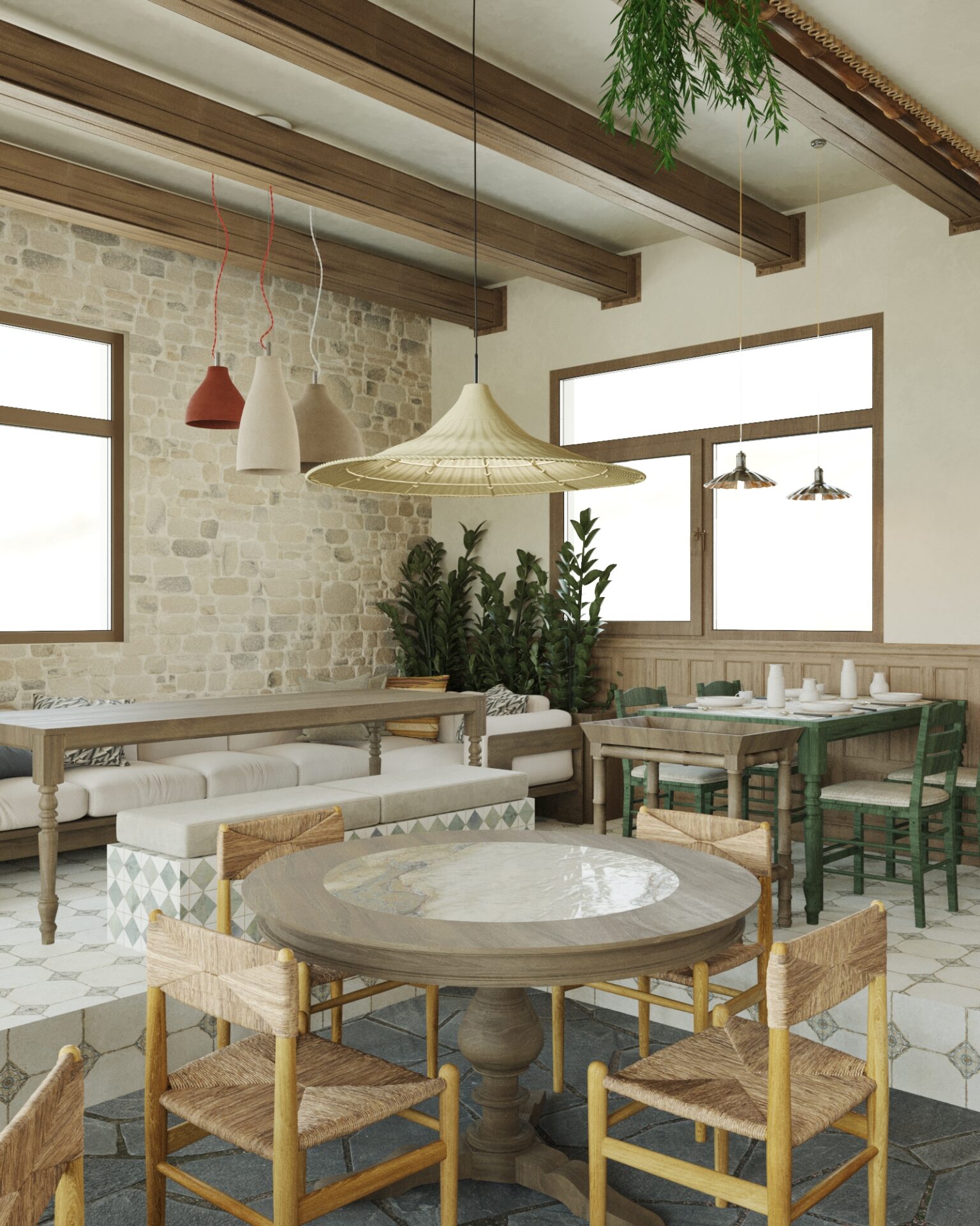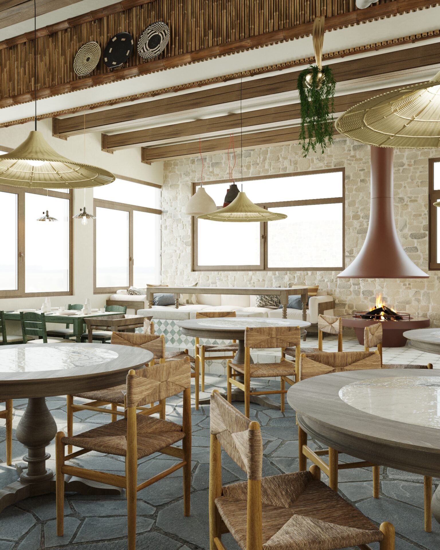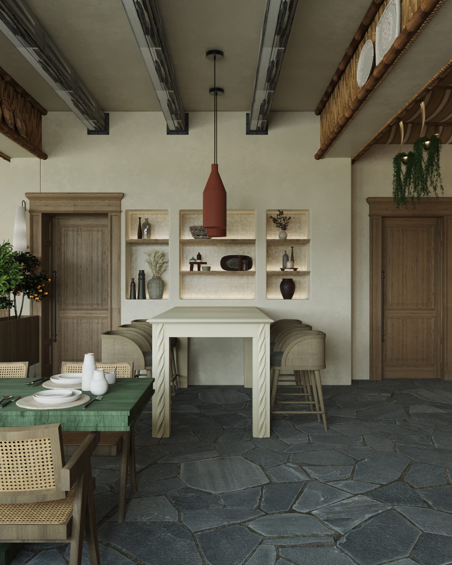 Τα φυσικά υλικά θέτουν τον τόνο — η υφή της πέτρας κάτω από τα πόδια αντιπαραβάλλεται όμορφα με τις λείες ξύλινες οροφές και τις χειροποίητες λεπτομέρειες. Η γήινη παλέτα του εσωτερικού, ο διακριτικός φωτισμός και οι απτικές επιφάνειες δημιουργούν αίσθηση ηρεμίας και διακριτικής κομψότητας. Κάθε γωνιά φαίνεται μελετημένη, προσκαλώντας τους επισκέπτες να αργήσουν και να συνδεθούν γύρω από φαγητό που γιορτάζει τόσο την παράδοση όσο και τη δημιουργικότητα.