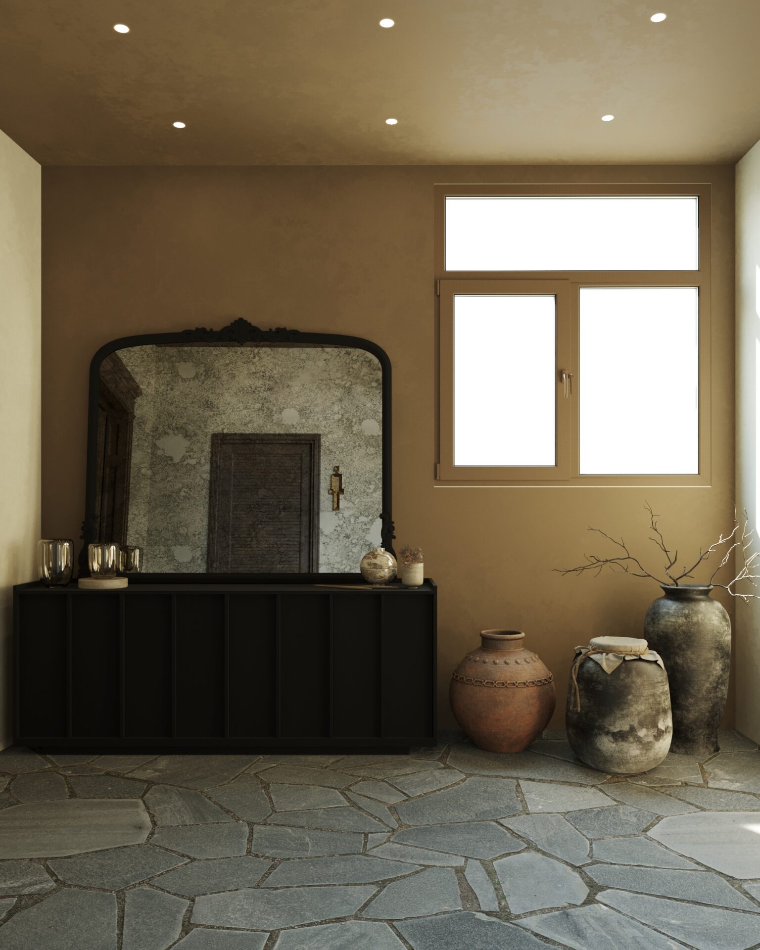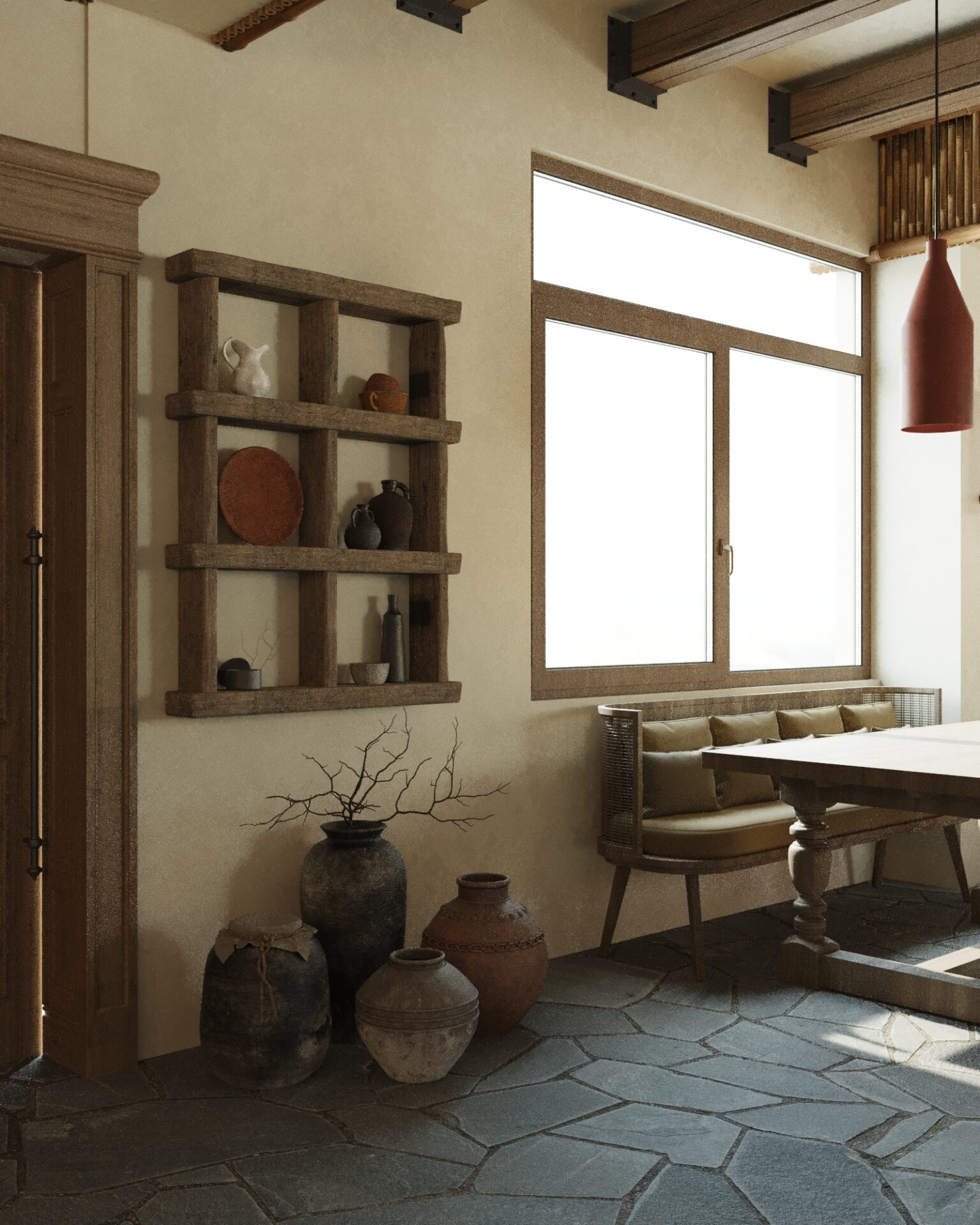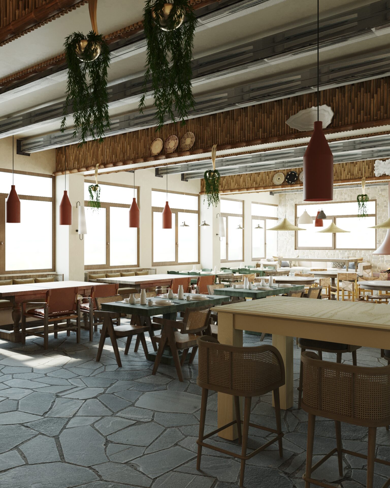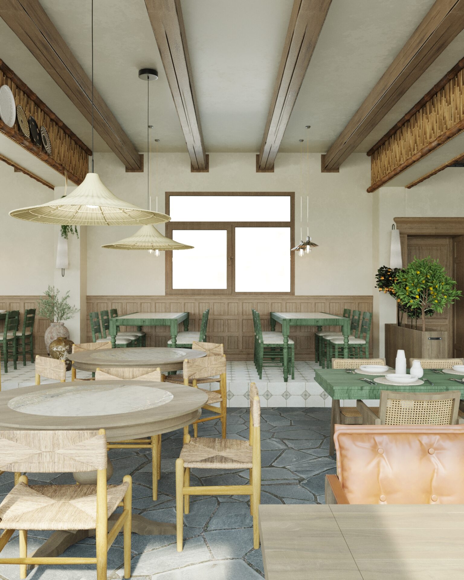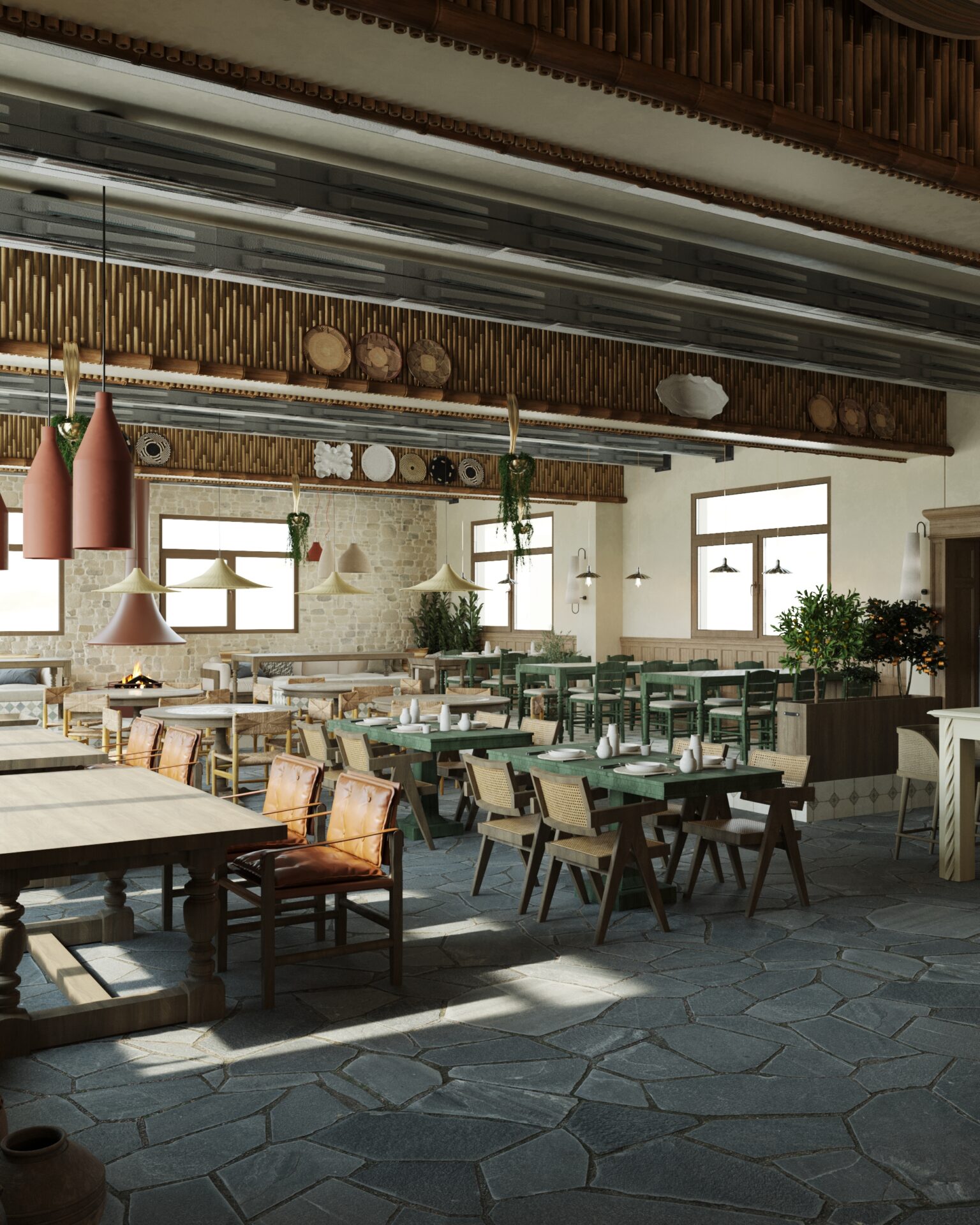 Τα φυσικά υλικά θέτουν τον τόνο — η υφή της πέτρας κάτω από τα πόδια αντιπαραβάλλεται όμορφα με τις λείες ξύλινες οροφές και τις χειροποίητες λεπτομέρειες. Η γήινη παλέτα του εσωτερικού, ο διακριτικός φωτισμός και οι απτικές επιφάνειες δημιουργούν αίσθηση ηρεμίας και διακριτικής κομψότητας. Κάθε γωνιά φαίνεται μελετημένη, προσκαλώντας τους επισκέπτες να αργήσουν και να συνδεθούν γύρω από φαγητό που γιορτάζει τόσο την παράδοση όσο και τη δημιουργικότητα.